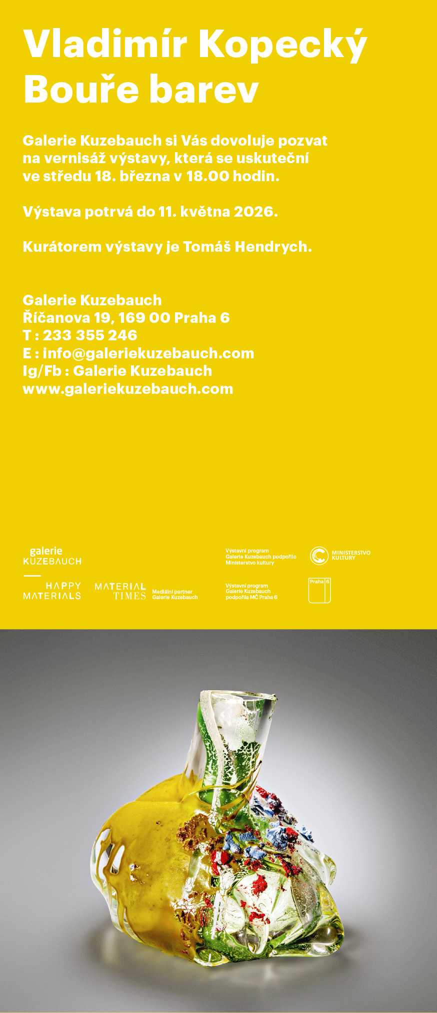 Plátna jsou doplněna sérií skleněných objektů s názvem Výkřik (2026), které vznikly speciálně pro Galerii Kuzebauch ve spolupráci s Martinem Janeckým a Janem Janeckým. Kopecký uplatňuje svůj malířský rukopis i na sklo. Jednotlivé barvy nanáší několika různými způsoby zevnitř i zvenku. Otáčením je nechává postupně stékat. Jeden tón barvy splývá s druhým. Tímto způsobem vytváří textury a efekty, které dodávají jeho dílům hloubku a expresivitu. Kopecký často míchá barvy, aby vytvořil unikátní odstíny a tóny a tím dosahuje velmi osobitých barevných kombinací. Sklo pro něj není cílem tvorby, ale prostředkem k vyjádření myšlenek, nápadů a emocí.